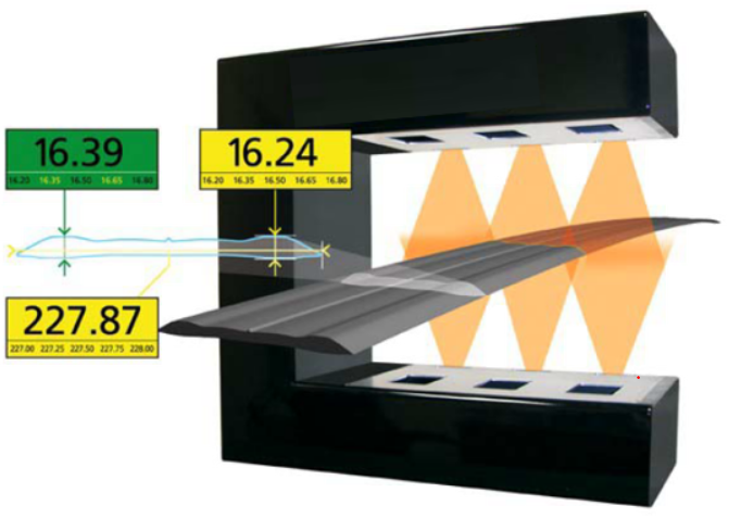 轮胎生产中,需要对胎⾯、胎侧等半制品截面尺寸进行质量把控,需要测量厚度、宽度、高度等尺寸,随时掌握胎⾯尺寸的变化情况,控制产品质量